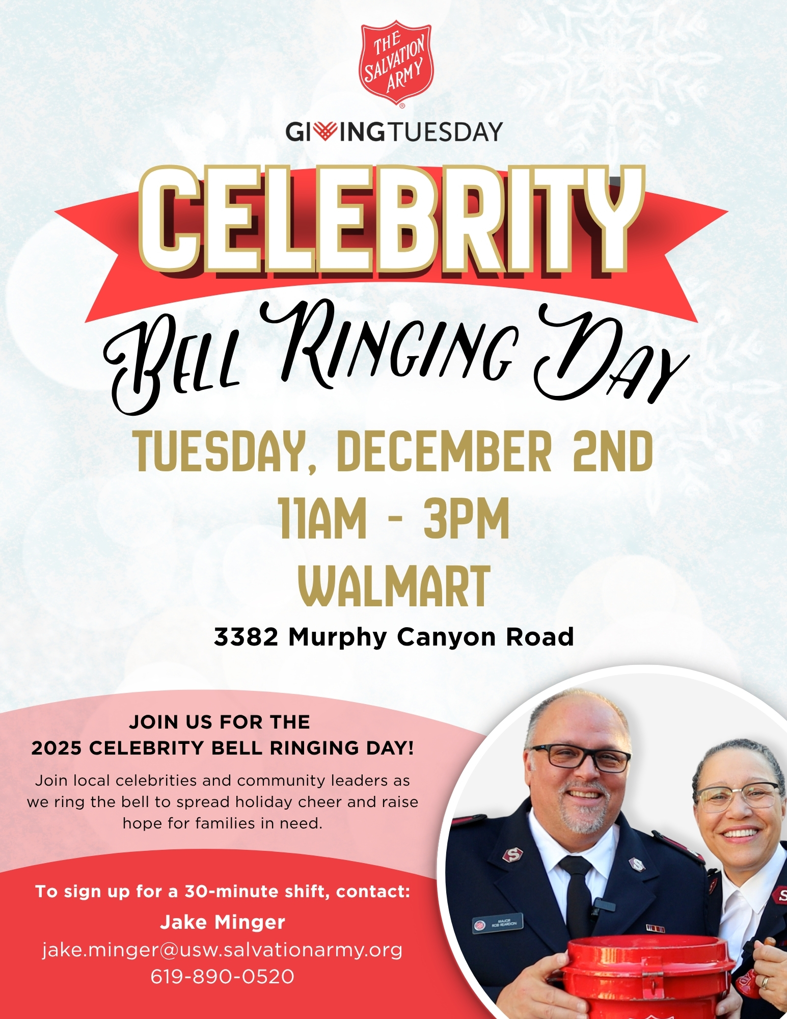 Celebrate Giving Tuesday with The Salvation Army as local celebrities and community leaders ring at the Red Kettle for hope! This festive event takes place at two Walmart locations across San Diego County, bringing our community together to spread holiday cheer and support families in need.