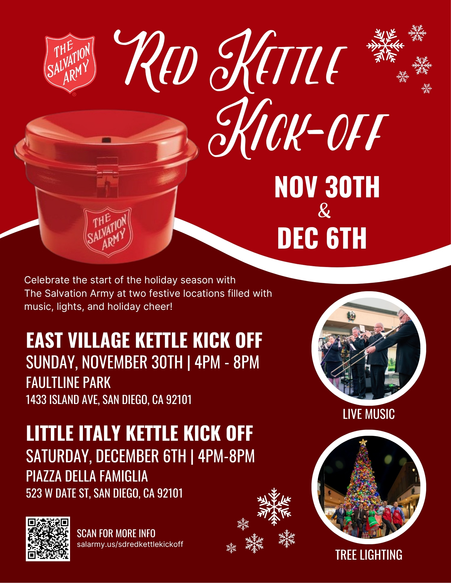 The holiday season officially begins with The Salvation Army’s Red Kettle Kick Off, a cherished tradition that brings music, lights, and joy to San Diego. This year’s celebration will take place at two festive locations — East Village and Little Italy — where families, friends, and neighbors can gather to embrace the spirit of giving and the warmth of the season.