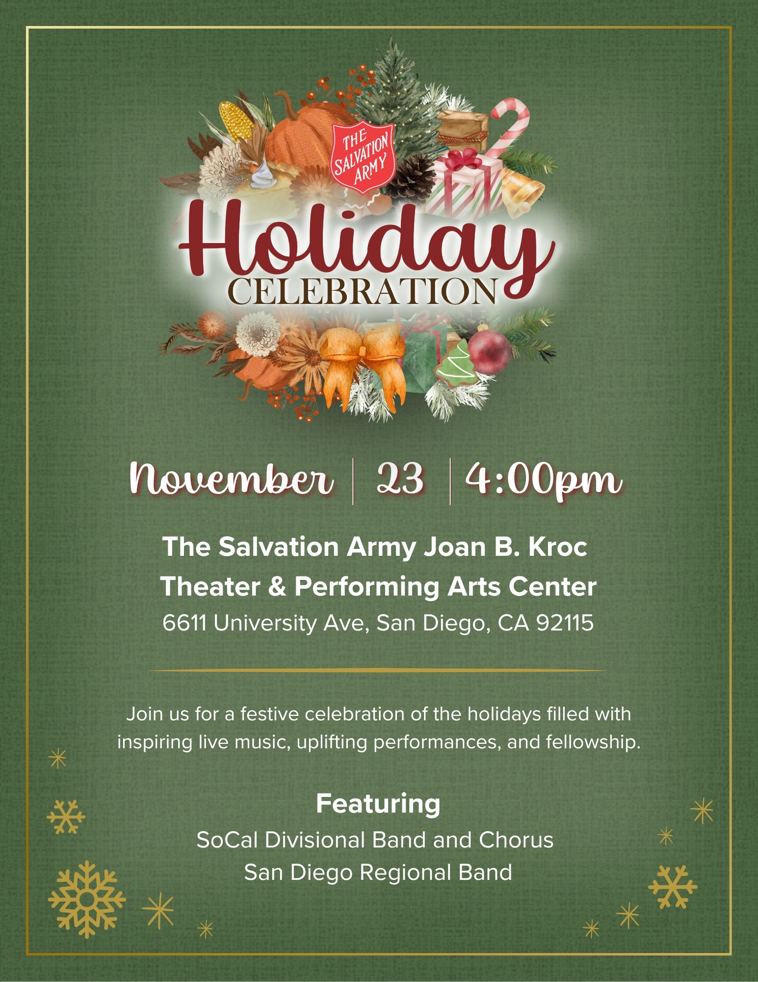 Join us at The Salvation Army Joan B. Kroc Theater & Performing Arts Center for a festive celebration of the holidays filled with inspiring live music, uplifting performances, and fellowship.